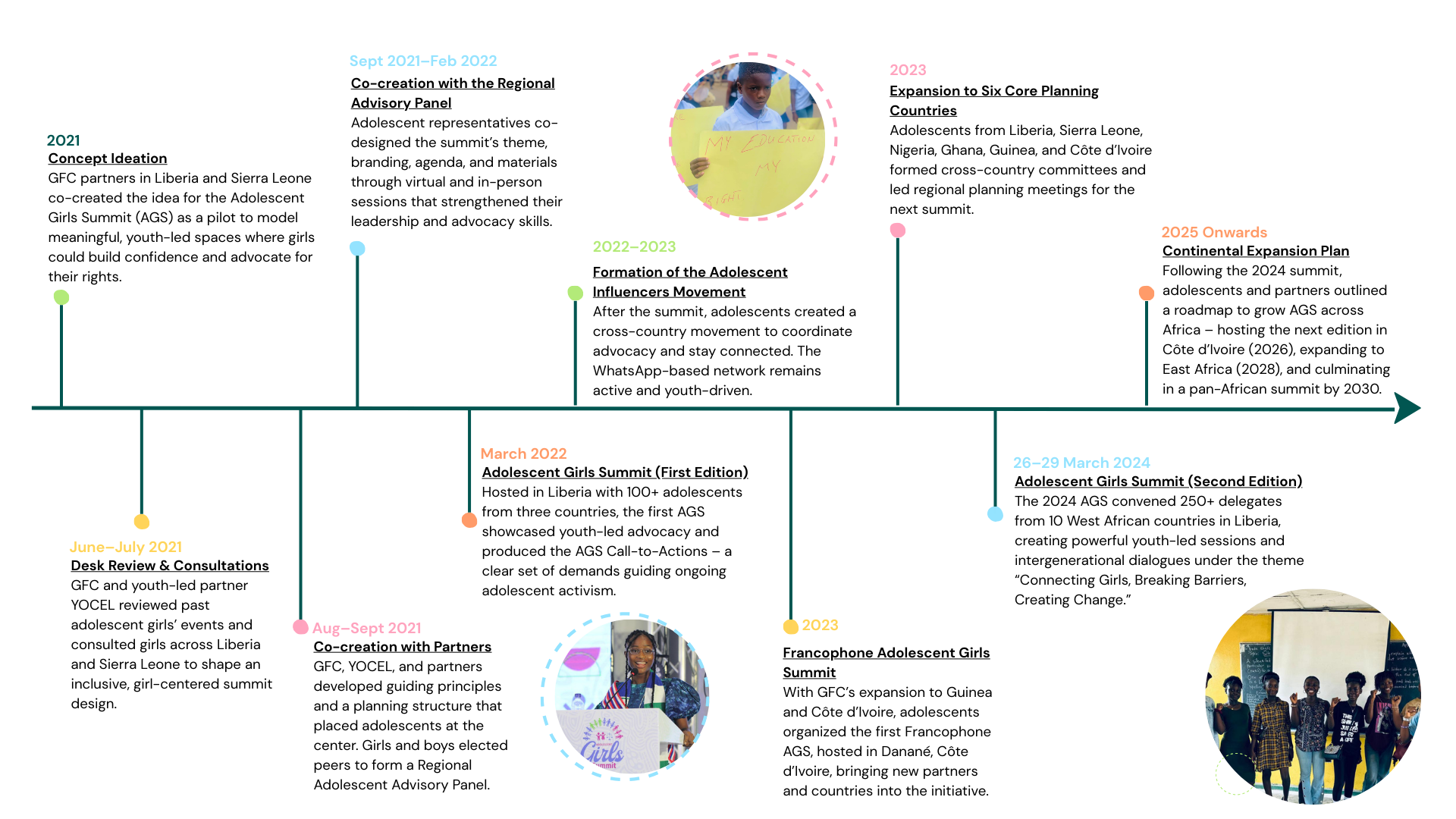 L'AGS est entièrement planifié et animé par des adolescents, avec le soutien de l'équipe du GFC, d'organisations partenaires et de jeunes mentors, plaçant le leadership et les perspectives des filles au cœur de leurs préoccupations. Le sommet constitue également une plateforme puissante de dialogue intergénérationnel et politique, mettant en relation les adolescentes avec les leaders communautaires, les décideurs politiques et les bailleurs de fonds pour co-créer des solutions. Son impact dépasse l'événement, stimulant l'action locale et renforçant le rôle des adolescents dans la construction d'un avenir plus juste et inclusif.