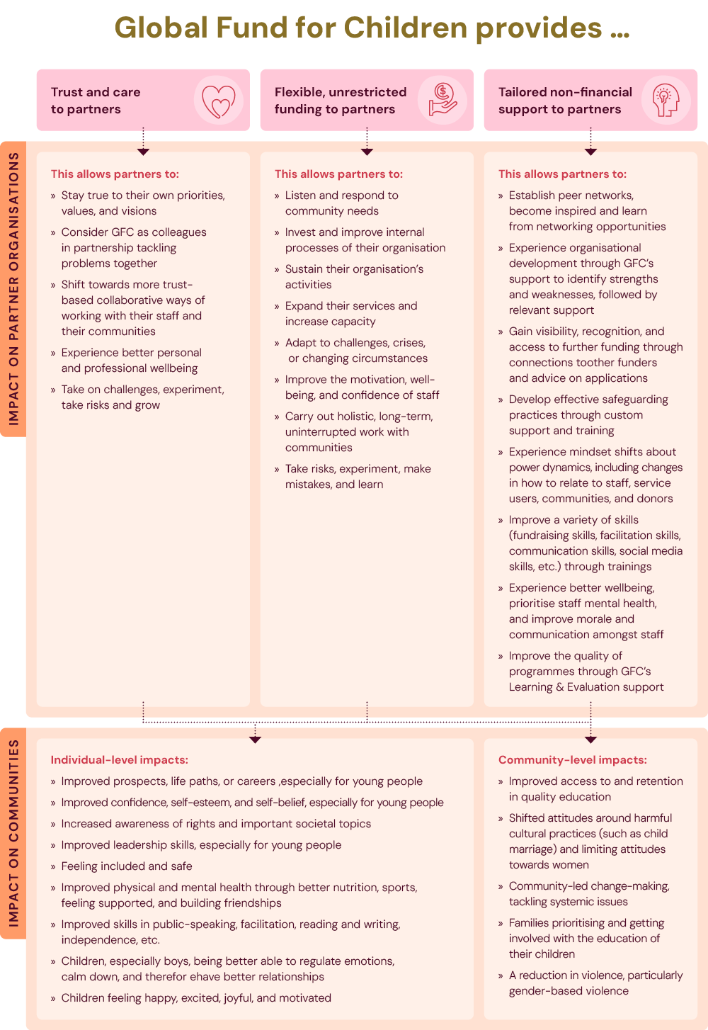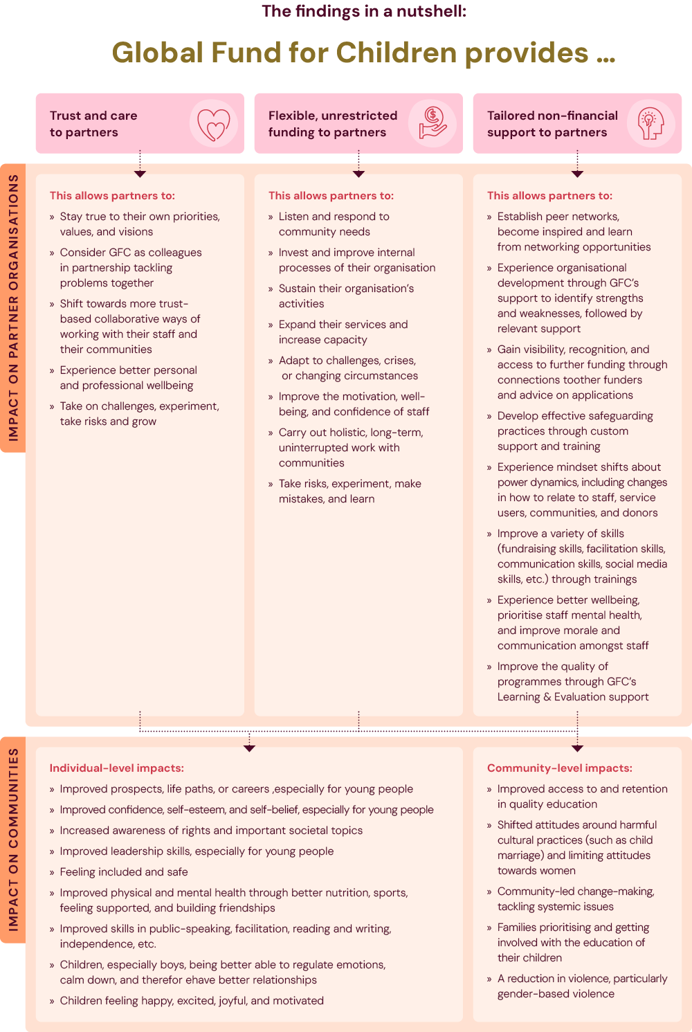 O estudo constatou que, por meio do financiamento flexível, do apoio não financeiro e da relação de confiança que a GFC oferece às organizações parceiras, ela contribui para seu crescimento e sustentabilidade. Essa capacidade fortalecida permite que os parceiros criem mudanças significativas em suas comunidades, desde educação de qualidade, fortalecimento da liderança local, melhoria do bem-estar comunitário, redução da violência (especialmente contra mulheres e meninas) e muito mais.
